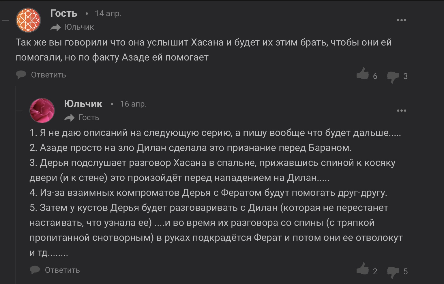 Да действительно......но мне кажется что и Зюмруд не дочь Ханифе.И вообще тут оказывается очень тёмная и сложная история,я кое-что что пересмотрела изначально но не сходится то одно то другое,а может Дилан и правда внучка Азаде